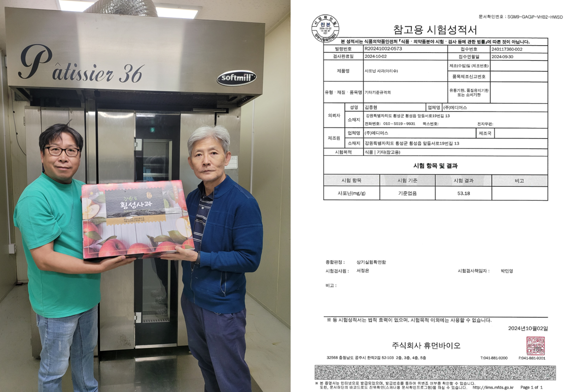 24년 재배된 사포닌사과는 10월말에 기능성이 함유된 혈당강하 쌀가루와 함께 횡성군의 대표 사과모찌, 사과파운드케익, 사과파이 등의 가공식품으로 생산될 계획이다.